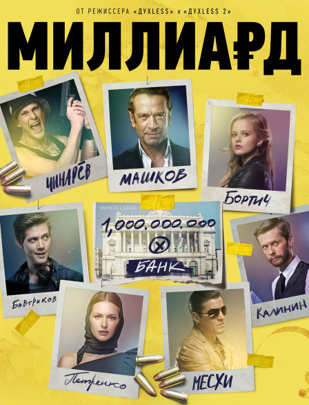 Информация о фильме ✦Оригинальное название: » Миллиард ✦Жанр: » Комедия, боевик ✦Продолжительность: » 01:36:46 ✦Перевод: » Не требуется ✦Страна: » Россия ✦Год выхода: » 2019 ✦Режиссер: » Роман Прыгунов ✦В ролях: » Владимир Машков, Александра Бортич, Гела Месхи, Павел Чинарёв, Марина Петренко, Мария Миронова, Даниил Спиваковский, Григорий Калинин, Федор Бавтриков, Дмитрий Астрахан и др.